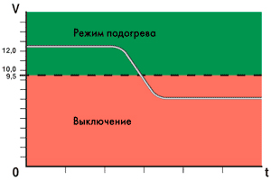 В том случае, если напряжение на выводе аккумулятора не превысит 9,5 В, то в течение 6 с отопительный агрегат выключается и переводится в режим заключительной фазы, которая длится не более 120 секунд.
