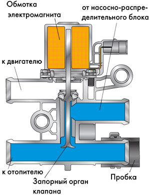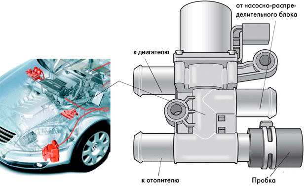 В случае автономного отопителя в контуре охлаждающей жидкости имеется двухходовой клапан. Когда отопитель работает, система охлаждения двигателя отключается от радиатора салона авто. Это осуществляется при помощи двухходового клапана. Клапан располагается в левом отсеке подкапотного пространства. Напряжение, которое подается на обмотку клапана, исходит непосредственно из блока управления автономным отопителем.