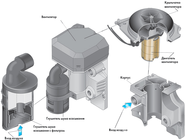 Так необходимый для поджога топлива воздух всасывается при помощи вентилятора через специальный впускной патрубок, имеющий в комплекте глушитель шума всасывания, и направляется через воздуховод к испарителю, а далее в камеру сгорания.